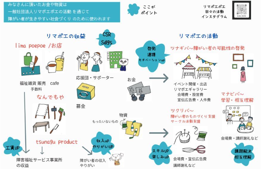 頂いたお金や物資は、一般社団法人リマポエポエの活動を通して障がい者が生きやすい社会づくりのために使われます